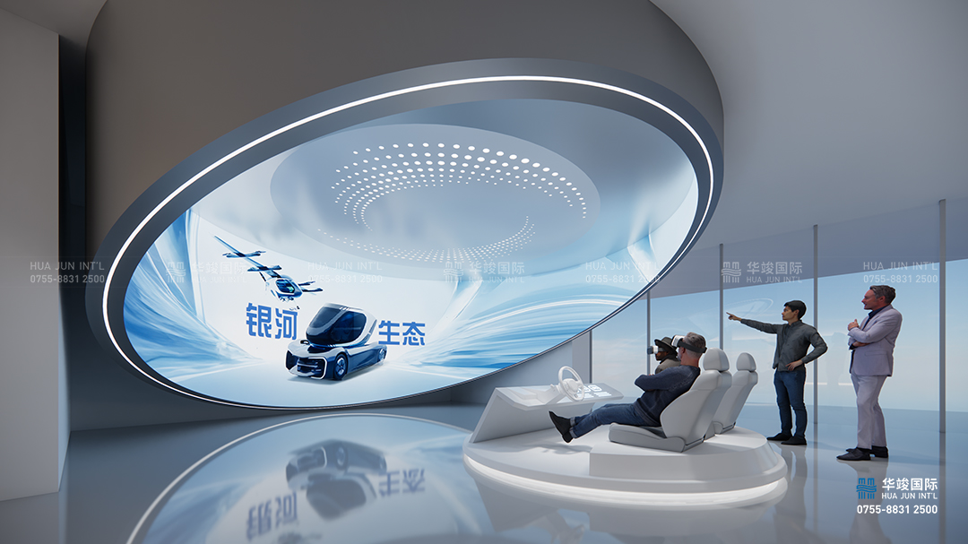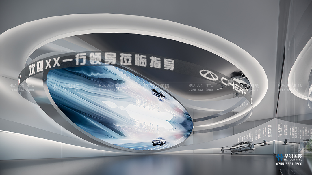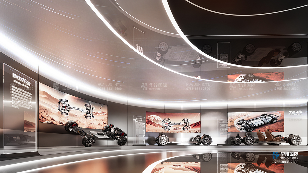 未來技術板塊作為新能源汽車展廳中的創(chuàng)新展示區(qū)域,重點展示未來汽車領域的核心技術與顛覆性創(chuàng)新產(chǎn)品,探索新能源、智能化和未來出行方式的無限可能。在這個區(qū)域,通過環(huán)屏營造出未來世界的想象空間,通過多樣化的技術展示和互動體驗,讓觀眾感受未來汽車的科技魅力與生活方式的全新定義。