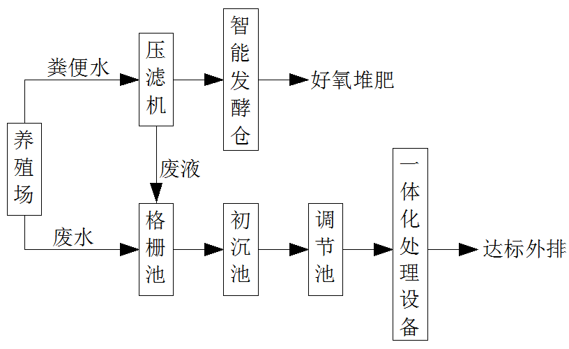 養(yǎng)殖場可采用清潔生產(chǎn)工藝,排放的糞便水人工清除至壓濾機固液分離后進入發(fā)酵池,發(fā)酵后作有機肥。沖洗廢水經(jīng)過機械格柵、初沉池初步固液分離,分離出的糞渣并入發(fā)酵倉,經(jīng)分離后的污水進入調(diào)節(jié)池進行調(diào)節(jié)水質(zhì)水量,使沼氣發(fā)酵單元穩(wěn)定運作。沼氣發(fā)酵池的沼液儲存于沼液存儲池中,進行沼液再利用。